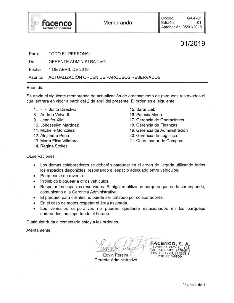 Les envío el memorando con relación a la actualización del ordenamiento de parqueos, por favor tomarlo en consideración ya que entra en vigencia a partir de mañana 02 de abril hasta nueva orden.